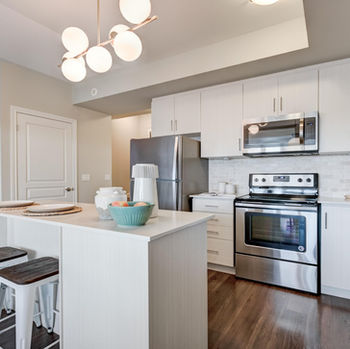 Head up the stairs and open the door to the main level. At the edge of the entryway sits a powder room with modern furnishings and floating vanity. Just off the hallway, the open concept floor plan shows off the living/kitchen/dining area. Large windows fill the space with light, while tray ceilings and high quality flooring add an elegant touch and make this layout ideal for entertaining. There’s plenty to love in the kitchen – stainless steel appliances, glistening white countertops, upper and lower cabinetry, and a large island offer both style and function.