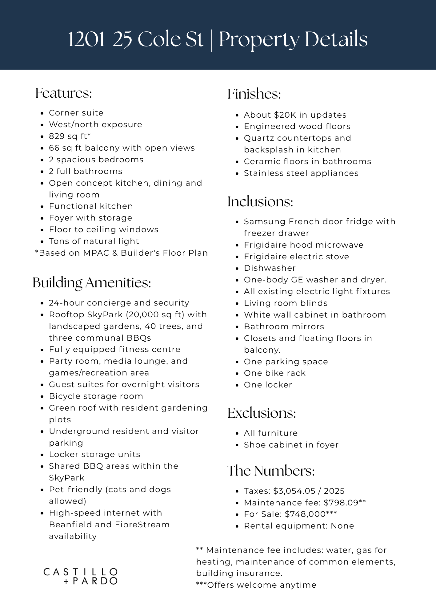 Located in a LEED Gold certified building, 25 Cole Street is known for its sustainable design and exceptional amenities including a three storey SkyPark, green roof, fitness centre, party room, and concierge service. Maintenance fees remain fair and include parking, a locker, and a bike rack.
