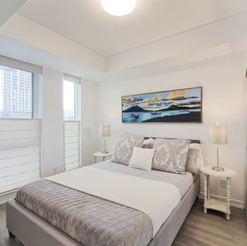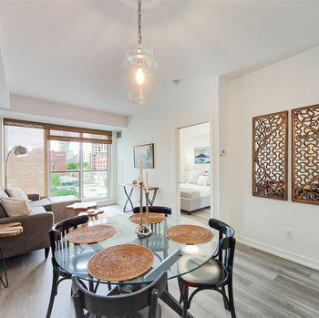 A $40,000 top-to-bottom renovation has reimagined this suite with style and purpose. The interiors feature premium vinyl flooring, upgraded designer lighting, a sleek and contemporary kitchen with full-size appliances, waterfall breakfast counter, high-end finishes with custom cabinets with spice pullout and soft closing drawers, and elegant fixtures throughout.