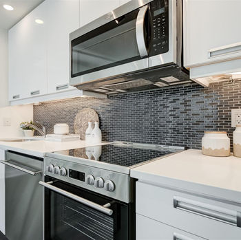 Clean lines and a neutral palette create the sleek, modern feel that carries throughout the unit. Dimensional, wide-planked laminate flooring draw you in as you find your way into the open living areas, complete with 9-foot ceilings. Floor-to-ceiling, south-west facing windows overlook the city streets and bring loads of natural light. An ideal home for entertaining, ample space along the walls and spacious interior lay the foundation to design the home layout of your dreams.